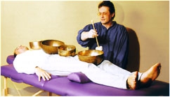 genannt, werden mehrere Klangschalen auf den bekleideten Körper des liegenden